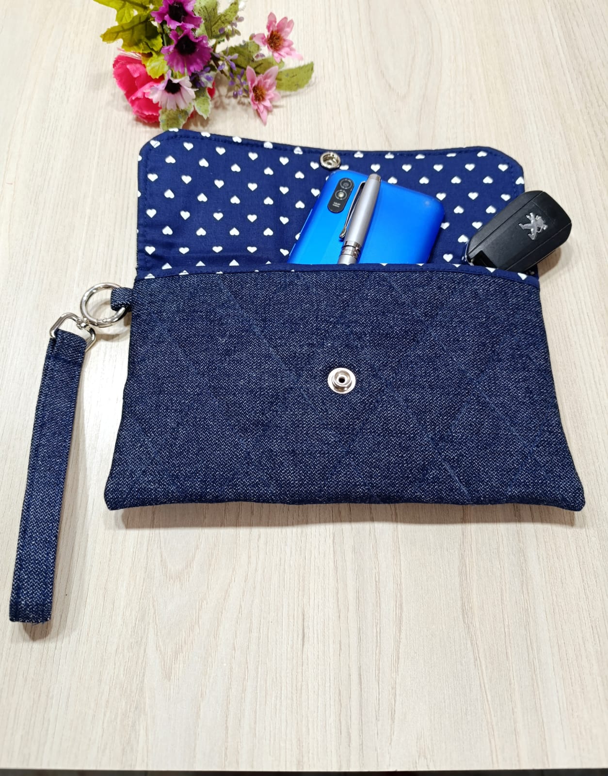 Clutch, com acabamento em matelassê e alça de mão e mosquetão. Confeccionado com tecido tricoline e estruturado com manta R2, fechamento com botão de pressão metal prata.